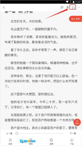 3、进入小说阅读页面后,点击空白区域,会弹出多种功能选项,在页面的右上角能看到一个耳机形状的图标。