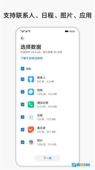 1.全面迁移:支持迁移包括联系人、短信、照片、视频、音乐、应用数据在内的多种数据类型,确保用户数据完整性。