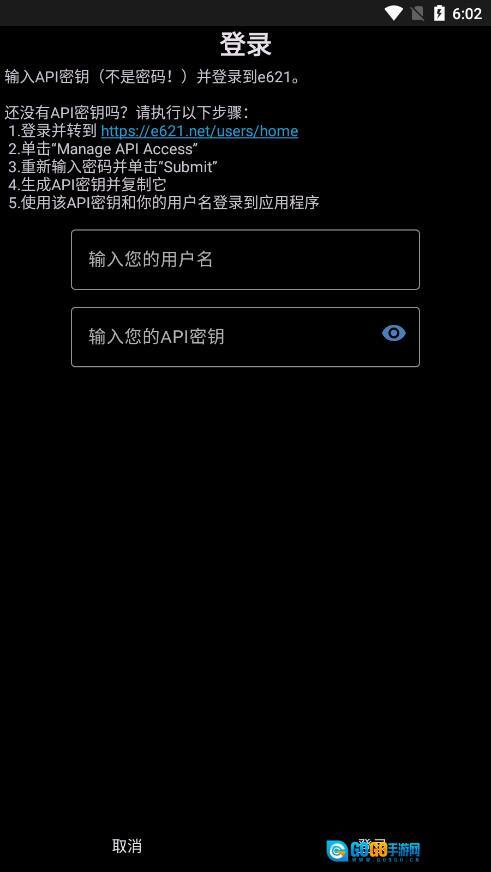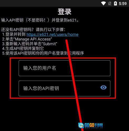 4、输入API密钥(不是密码!)并登录到e621