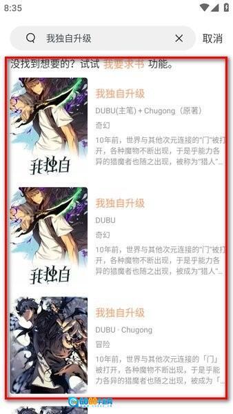 软件随后会呈现多个搜索结果,由于存在多个漫画源,因此结果不止一个。
