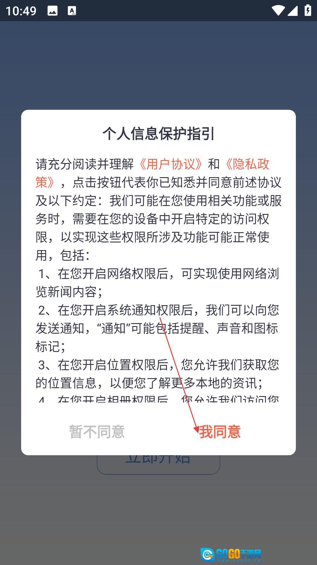 1、安装完成后进入,需在用户协议和隐私政策界面点击同意,接受相关条款后才能进入应用。