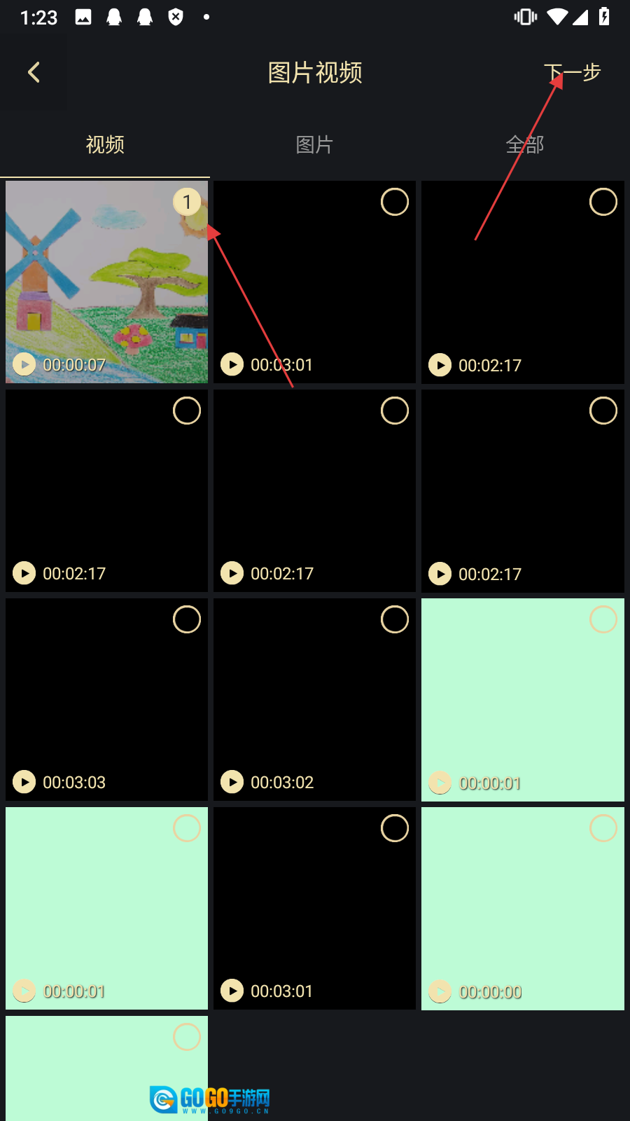 2、进入图片视频选择界面后,挑选需要【编辑的视频】并点击【下一步】,即可进入视频编辑界面。