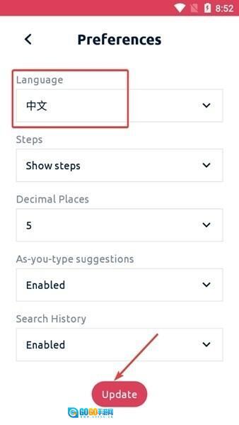 3、把language调整为中文,完成后点击下方的update按钮就可以了