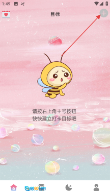1、点击右上角的加号按钮即可进入创建新目标的入口,开始设定个人打卡计划;页面中间的蜜蜂卡通形象增添了趣味性;底部导航栏方便用户快速切换不同功能模块。