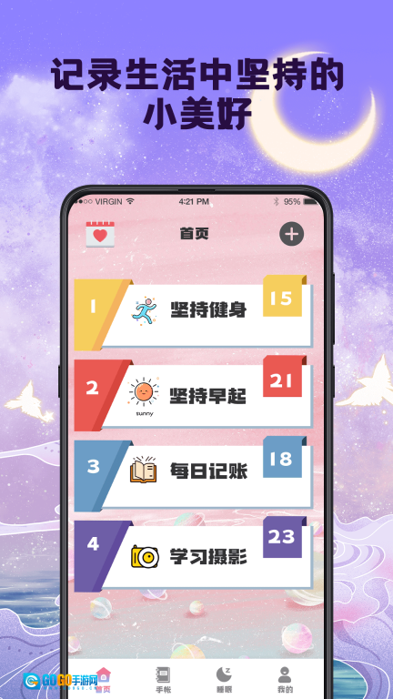 3、纯净,支持个性化定制:界面保持零广告干扰,同时提供项目快捷设置与自定义功能。作为一款轻量便捷的工具,它巧妙融合了打卡与闹钟功能,助力用户在简洁清爽的环境中高效操作,充分满足个性化使用需求。