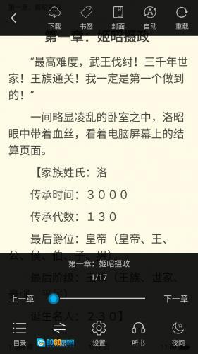 2、运用仿真实体书籍阅读体验的技术,具备夜间阅读模式、朗读功能以及滚屏功能。