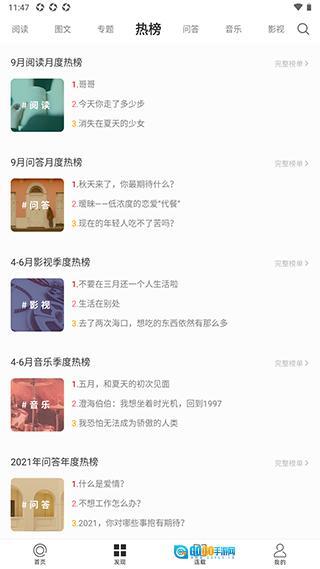 3、点击发现栏,可查看各类专栏,涵盖阅读、图文、专题、热搜榜、问答、音乐及影视等内容。