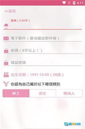 2、在注册页面中输入名称、电子邮箱、密码、出生日期等,并选择自己要注册的类别;