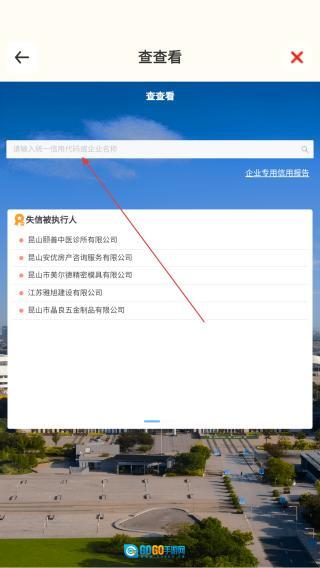 2、在【查查看】页面,点击【请输入统一信用代码或企业名称】输入框,填入信息查询企业相关内容搜索。
