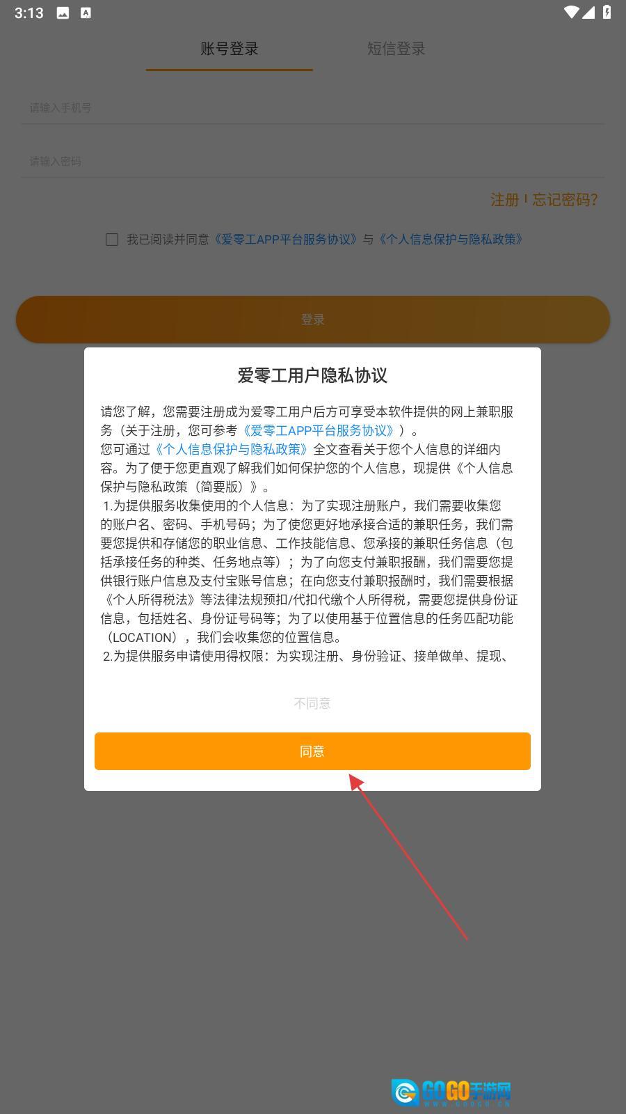 1、打开软件后,跟随箭头方向点击【同意】。