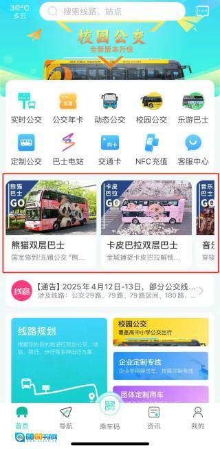 2、无锡公交首页:查实时公交、校园公交等,点特色巴士(熊猫/卡皮巴拉双层)看详情,用搜索栏找线路站点。