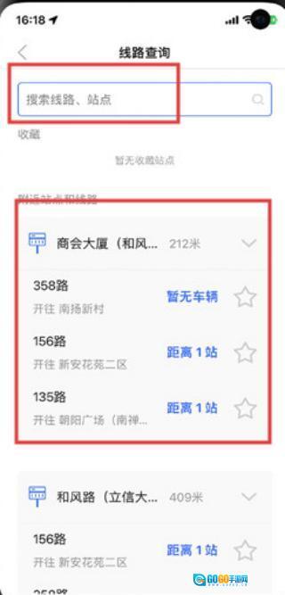 1、线路查询:搜线路/站点,查附近站点(商会大厦、和风路)及公交(156路距1站等),规划出行。