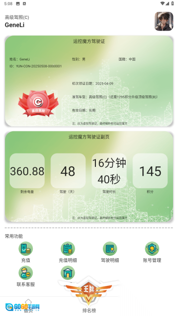 3、平台设有排名榜单展示遥控车的排名情况,用户可以查看驾驶证的详细信息以及副业相关内容,同时还能回顾充值明细。