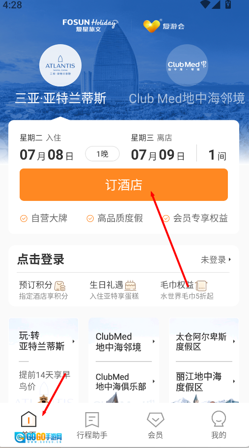 1、打开复游会App进入首页后,点击“订酒店”入口,即可开始查找度假住宿的相关选项。