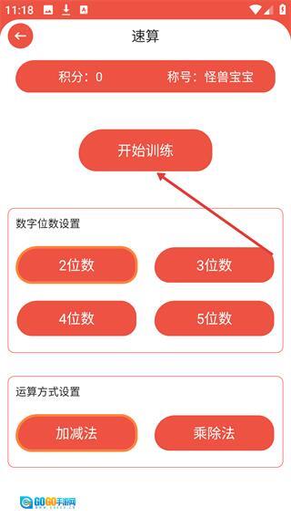 2、选择【2-位数】的数字位数和【加减法】的运算方式,确认好参数后点击【开始训练】按钮,即可进入答题环节。