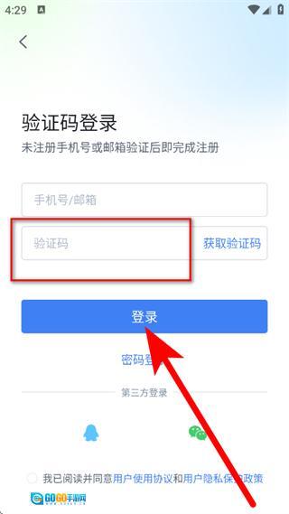 4、在输入框中填写验证码,勾选相关协议,然后点击登录按钮,即可完成账号登录操作。