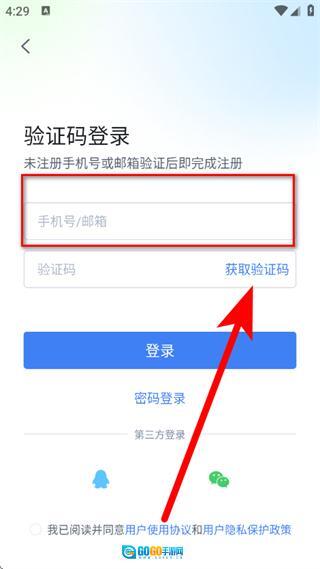 3、在登录页面,输入手机号邮箱,点击获取验证码。