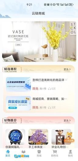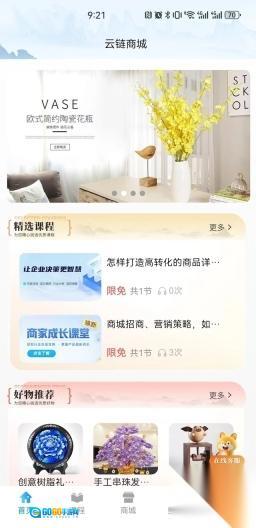 首页设有精选课程与好物推荐两大版块,商家能够随时高效学习各类课程。