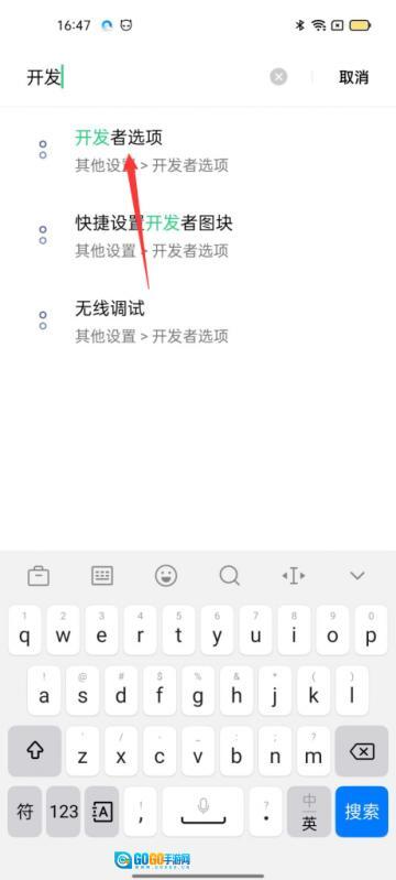 5.开启开发者模式后,返回设置界面,选择搜索框,输入开发,进入开发者选项。