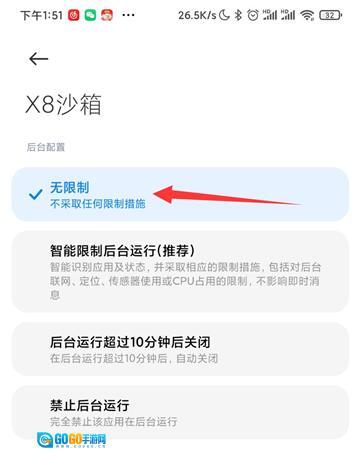 再进入应用智能省电,找到X8沙箱,设置无限制