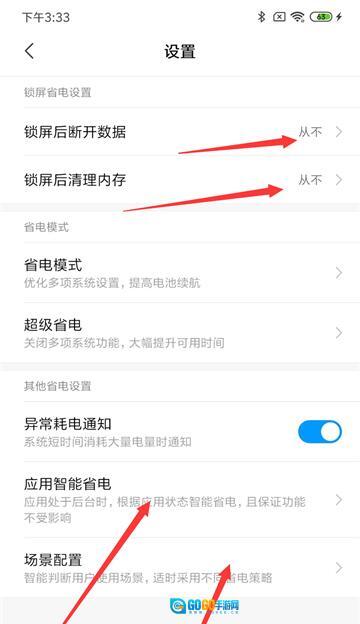 设置锁屏从不断开数据和从不清理内存。