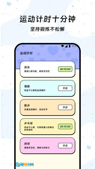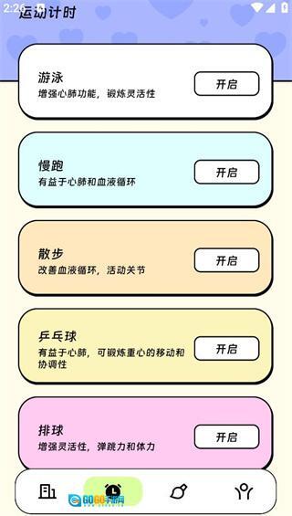 1、专业适配运动计时场景,覆盖游泳、慢跑、散步、乒乓球、排球等丰富运动类型,配备专属计时功能,同时清晰标注各类运动对应的健康益处,帮助用户实现更科学的锻炼方式。