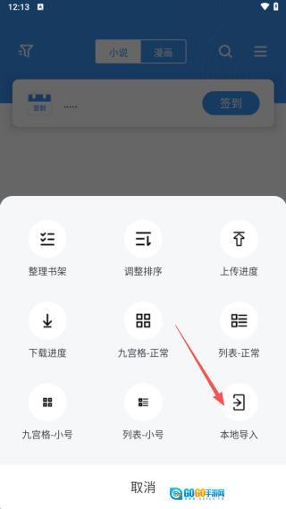 2、这里具备整理书架、调整顺序、上传进度、查看进度等功能,可点击本地导入。