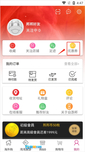 1、用户进入之后,选择“我的”中的“优惠券”。