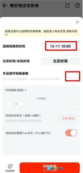 4、在转跳的界面中选择抢购时间,设置抢购参数(这里根据自己的手机延迟进行选择,建议提前50-100)。