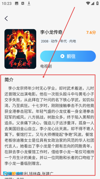 4、在影视详情页,查看【简介等信息】即可完成搜索影视剧操作。
