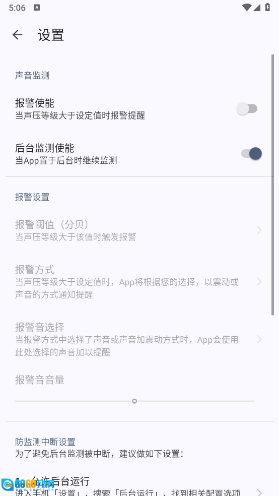 可参考App设置页面里「防监测中断设置」板块的说明,完成「允许后台运行」「忽略电池优化」「关闭省电模式」这些设置项的配置。
