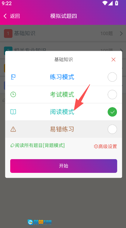 2、在套题页面选择阅读模式,点击开始。