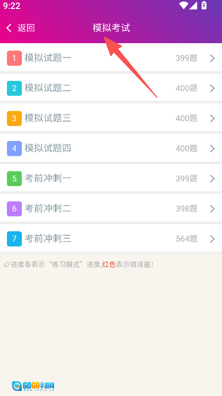 1、进入模拟考试页面,选择目标套题。