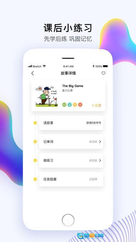 2、故事学习板块:精选优质小故事,支持在线翻译与听读功能,搭配课后小练习,帮助学习者扎实掌握每篇故事的核心词汇。