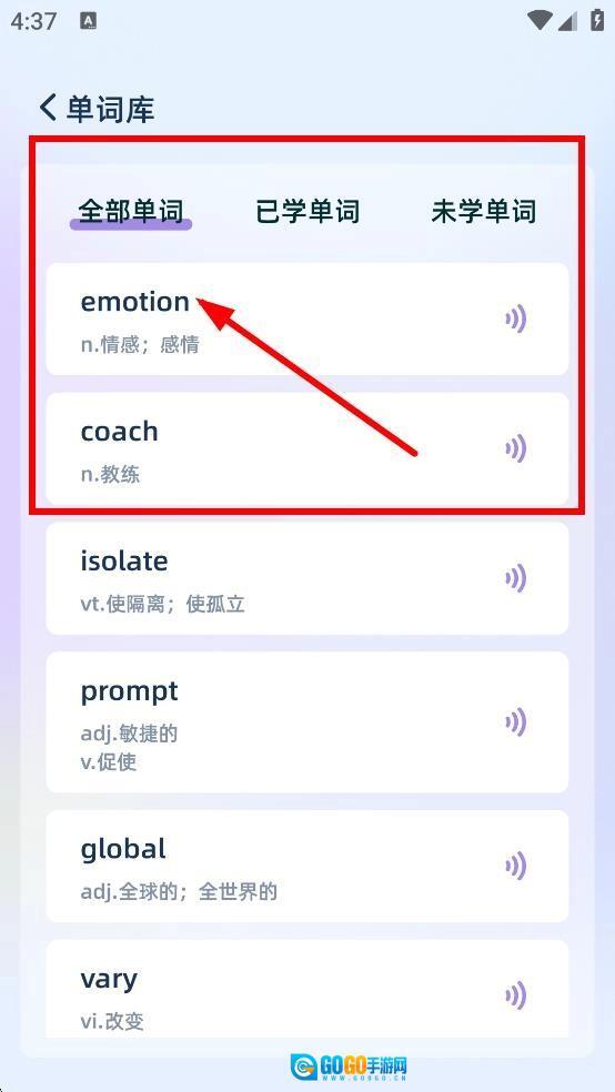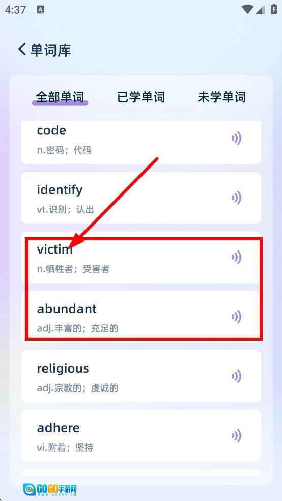 3、在完整的单词列表中继续浏览,可查看更多单词,也能点击收听发音。
