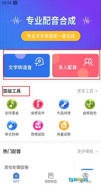 1、打开配音猫应用后,在首页能看到三大核心功能入口,分别是文字转语音、多人配音和高级工具。