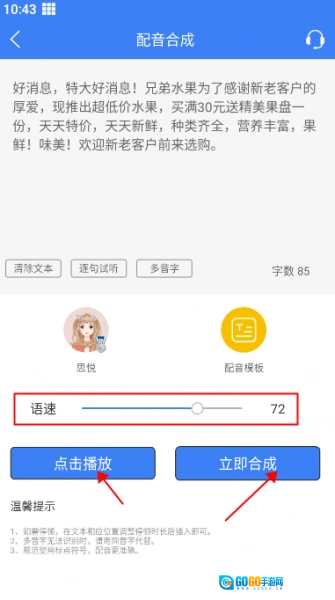 5、最后点击试听并调整到合适的语速,等你觉得满意后,点击立即合成,就能完成这段文字转语音的操作了。