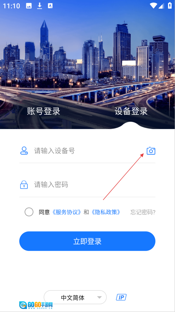 在设备登录界面,点击【相机图标】进入扫码登录页面。