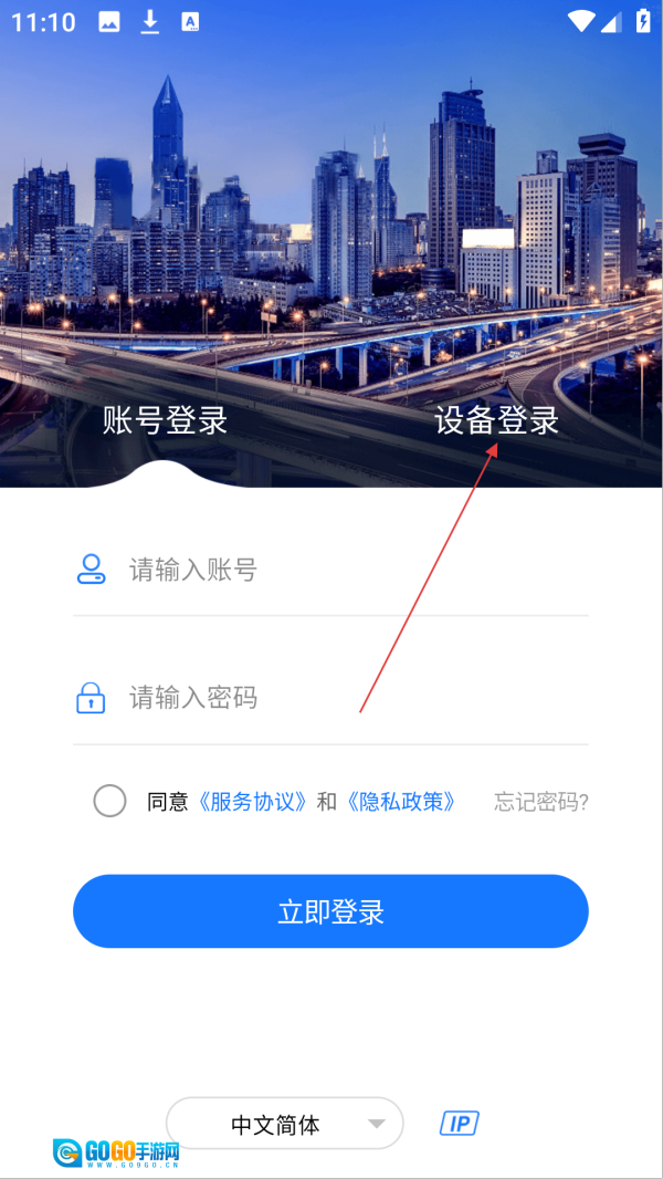 在登录页面点击【设备登录】选项,即可切换至设备登录界面。
