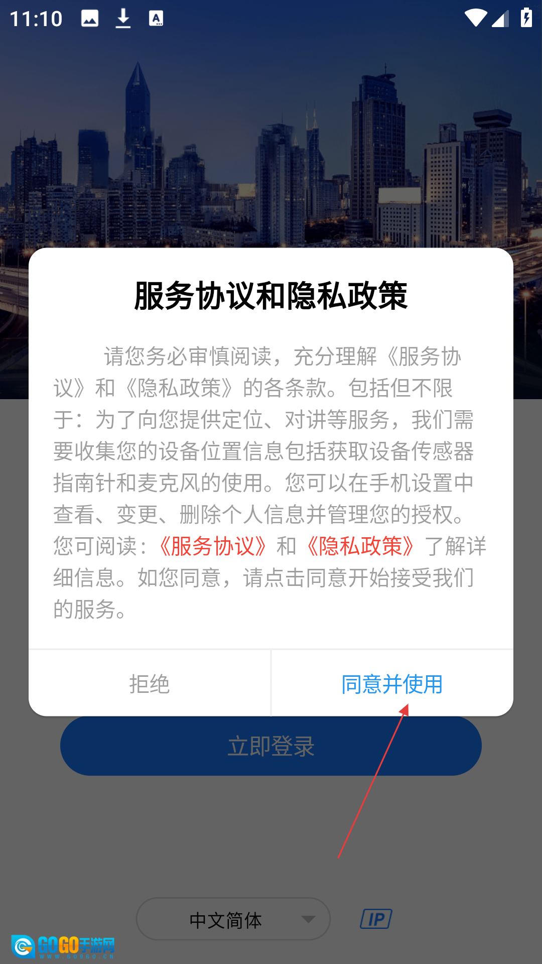 打开GPS51后,点击【同意并使用】按钮,以此同意相关的服务协议与隐私政策。