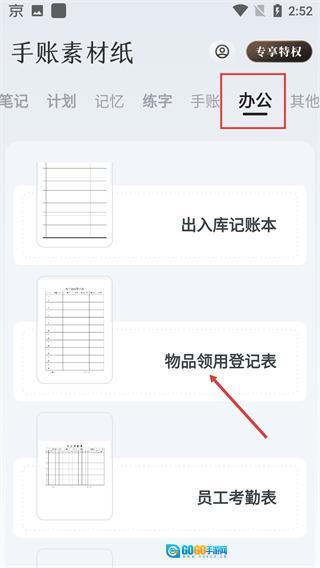 切换到【办公】标签页,点击领取【物品领用登记表】的模板,以满足职场办公类的记录需求。
