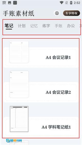 进入手账素材纸的【笔记】标签页,能挑选【A4-会议记录1】、【A4-学科笔记纸1】之类的模板,页面顶部还可以切换其他不同的标签。