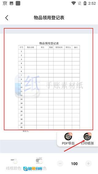 进入【物品领用登记表】的详情页面后,借助【打印纸张】和【PDF-导出】这两项功能,就能完成表格的实体打印操作或是电子形式的存储。