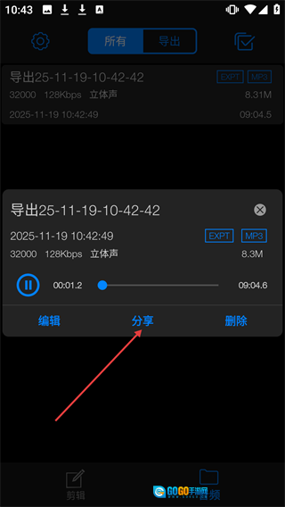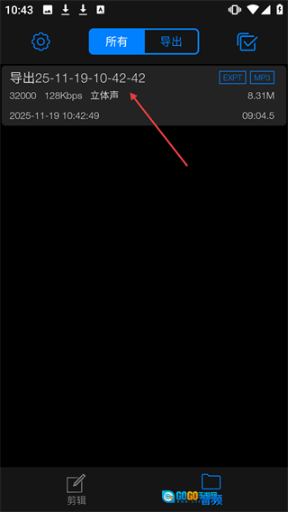 在音频管理界面里找到名为“导出25-11-19-10-42-42”的目标音频文件。