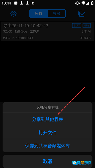 在分享选项里选择【分享至其他应用】,就能完成音频的分享流程。