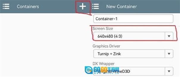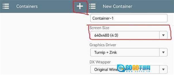 2、在导入游戏前,我们得先创建一个容器。具体操作是通过首页点击“+”来创建,接着进行选项设置——这里要依据待导入的游戏来调整参数,像分辨率尺寸、Direct sound以及Direct Music等,以此保证游戏导入后画面显示大小合适,背景音乐也能顺畅播放。