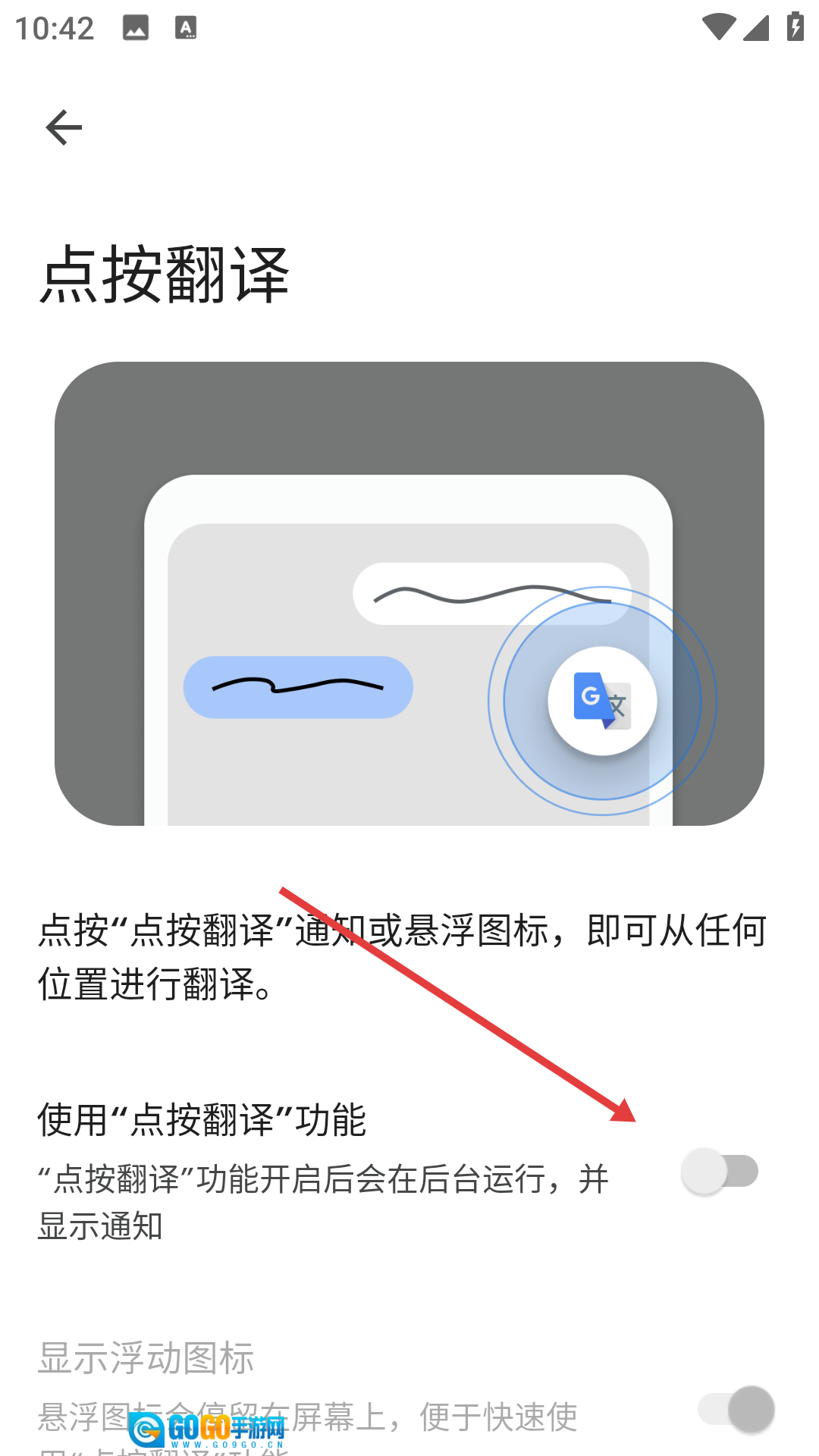 在点按翻译的设置页面中,打开【使用“点按翻译”功能】的开关,即可启用该功能。
