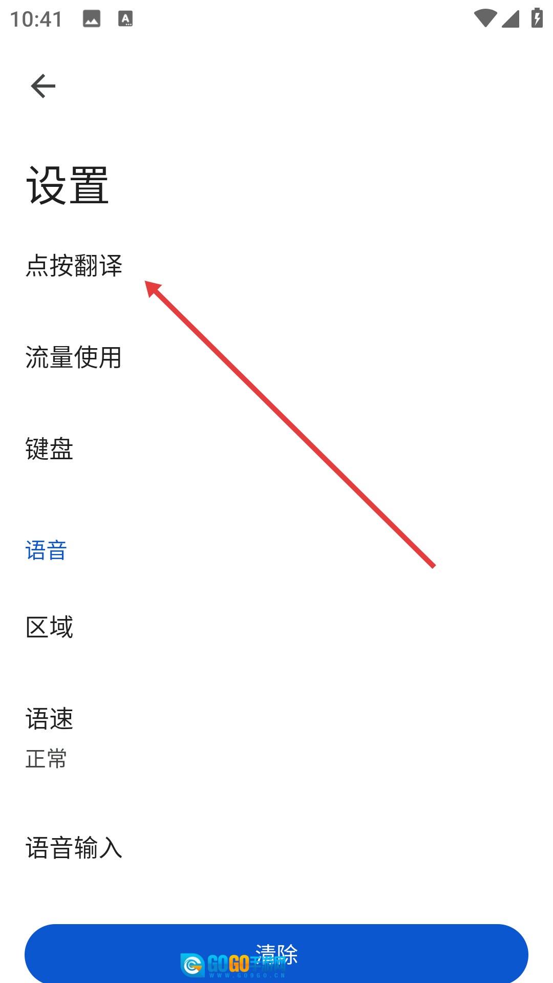在设置界面中找到并点击【点按翻译】选项,即可进入点按翻译的设置页面。