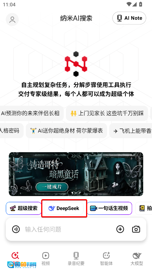 打开纳米AI搜索,在搜索界面点击输入框上方的“DeepSeek”就能使用