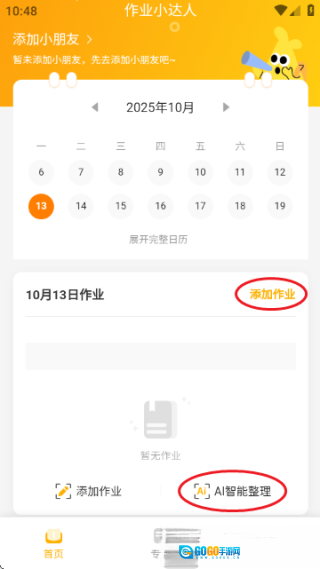 回到首页后,先挑选具体日期(例如10月13日),接着点击“添加作业”按钮——可以手动录入作业的具体内容,也能选择“AI智能整理”功能并上传作业照片,之后耐心等待系统自行将内容拆解成任务清单。